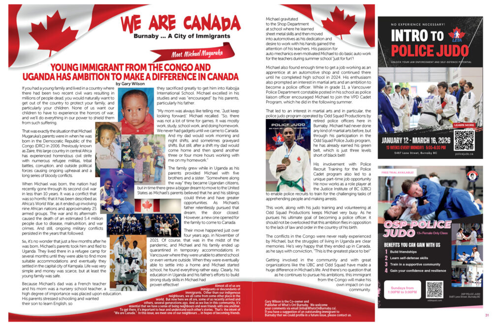 We’re pleased to see Odd Squad Police Judo Student / Volunteer Michael Mugaruka featured in What’s On! Burnaby this month. Michael first started judo at VPD Judo when Brian Shipper ran the programs at the VPD Tactical Training Centre.
